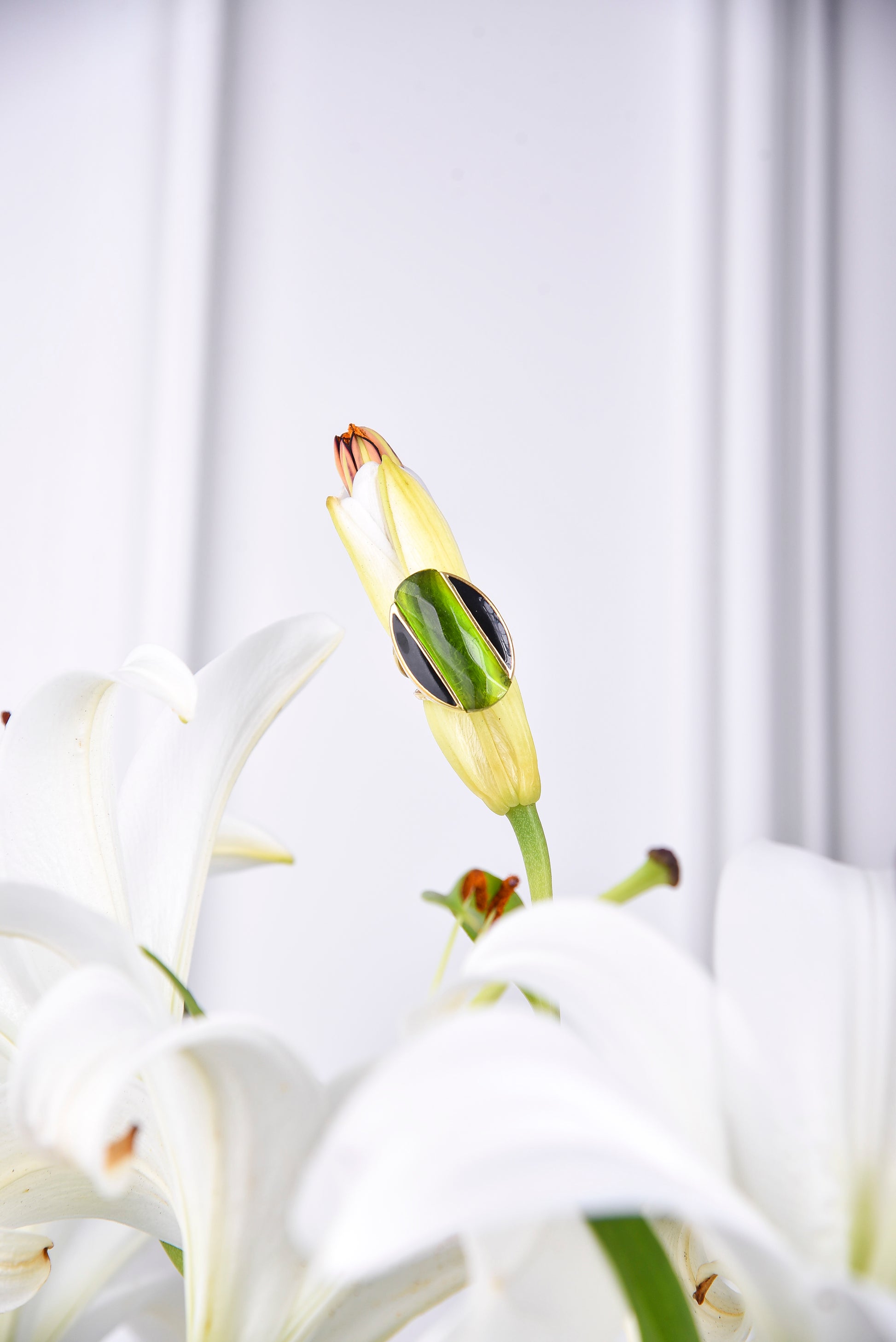 Crafted with 18k gold vermeil, sterling silver, peridot, and black enamel. In line with our sustainability goals, our peridot stone is lab-grown and physically identical to mined peridot. Our lab-grown peridot stones offer higher quality and clarity than their mined equivalent. Ring Height and width: 30.5mm by 22mm, and thickness: 5mm. Band height: 4mm & depth: 1.5mm.