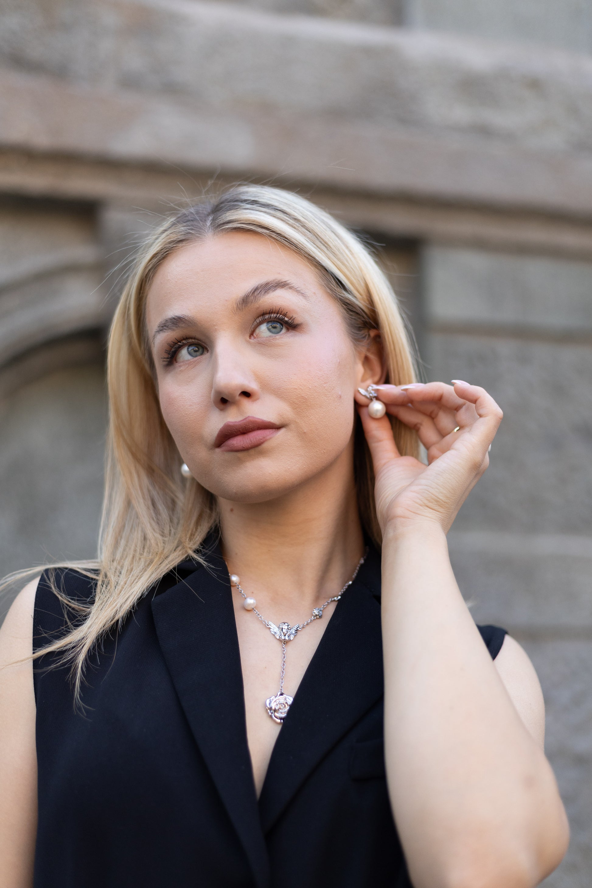 Silver Rhodium Plated Cupid & Roses, Shell and Freshwater Pearls. The Ascend Earrings and Devotion Necklace are a graceful tribute to self-love in its most sacred form. Creamy pearls, sculpted roses, and a tender Cupid come together to honor the beauty of giving yourself the love you’ve always craved. Wear it as a quiet vow to cherish your own tenderness, elegance, and worth.
