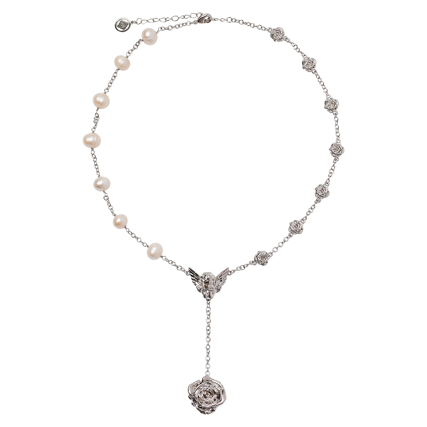 Silver rhodium over brass and freshwater pearl. *Due to the one-of-a-kind nature of freshwater pearls, the shape of the pearls may vary slightly from the image shown. Chain length: Adjustable from 16" to 18". Pearl and roses measure 8mm by 8mm. Rose Pendant length & width: 20mm by 20mm. Cupid length & width:15mm by 20mm